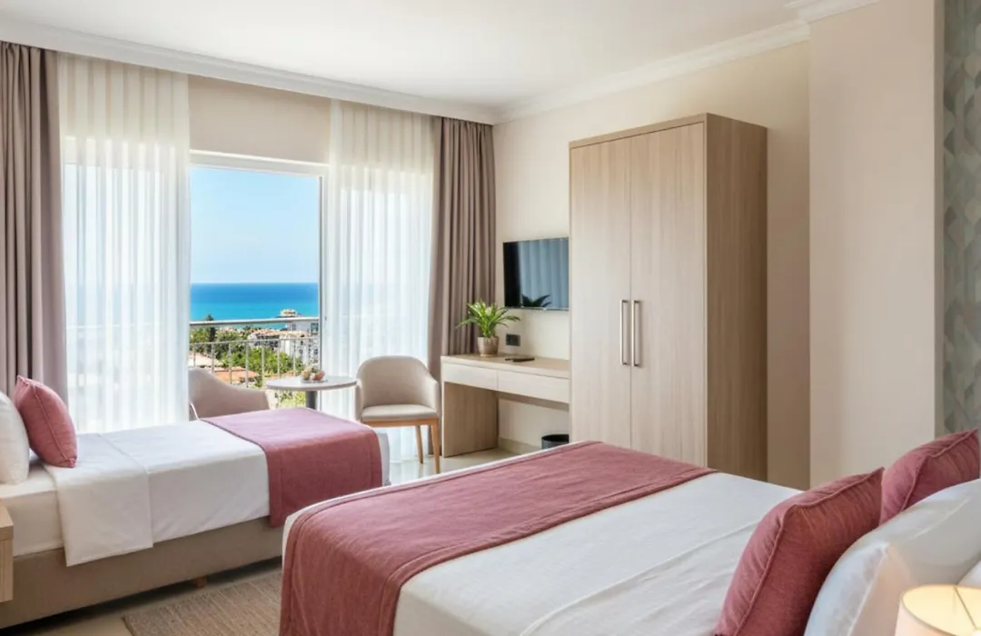 Deniz manzaralı odalar sunulmaktadır.